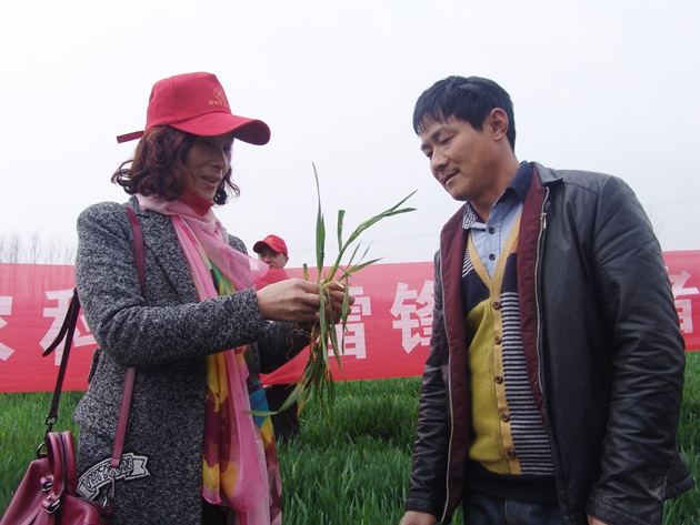 我院小麥專(zhuān)家周?chē)诟毖芯繂T對當地50多名農民群眾進(jìn)行了小麥中后期田間管理技術(shù)的培訓,講解了分類(lèi)施肥、預防倒春寒、及時(shí)清溝降漬、防治病蟲(chóng)害等小麥中后期田間管理的關(guān)鍵技術(shù),并對他們在種植過(guò)程中提出的各種問(wèn)題給予了詳細的解答。培訓結束后,市農科院專(zhuān)家們還來(lái)到道明種植業(yè)合作社小麥種植基地,查看了土壤墑情和小麥苗情,周?chē)诟毖芯繂T還對其中一塊小麥因除草劑使用不當造成的黃苗、死苗現象進(jìn)行了現場(chǎng)講解,根系發(fā)育不良、分蘗減少、株高降低、葉片發(fā)黃、嚴重影響產(chǎn)量,這些因人為因素導致的藥害癥狀觸目驚心,極大地震撼了在場(chǎng)的每一個(gè)人,也使大家深刻認識到科學(xué)種田的重要性。