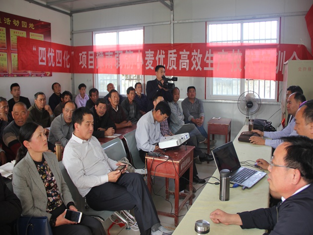 10月27日,河南省“四優(yōu)四化”重大農技推廣項目?jì)?yōu)質(zhì)弱筋小麥高效栽培技術(shù)培訓會(huì )在淮濱示范縣新里鎮雙廟村示范點(diǎn)召開(kāi),淮濱縣農業(yè)局副局長(cháng)王振旭主持會(huì )議,我院副院長(cháng)劉祥臣、院小麥所負責同志、淮濱縣農業(yè)局分管領(lǐng)導和技術(shù)骨干以及淮濱縣各示范點(diǎn)技術(shù)負責人、種田大戶(hù)、專(zhuān)業(yè)合作社、農戶(hù)代表等40余人參加了會(huì )議。項目主持單位河南省農科院小麥研究所邵運輝博士、晁岳恩博士, 我院陳金平研究員進(jìn)行了專(zhuān)題授課。