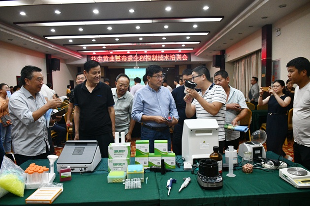 培訓會(huì )上,中國農科院油料作物研究所張奇研究員作了《花生黃曲霉毒素污染發(fā)生與全程控制技術(shù)》的專(zhuān)題報告,講述了花生黃曲霉毒素發(fā)生的影響因素,對全程預防和控制黃曲霉毒素發(fā)生并給出了對策。中國農科院油料作物研究所王督博士詳細講解了幾種花生黃曲霉毒素快速檢測技術(shù)。河南省農業(yè)科學(xué)院農業(yè)質(zhì)量標準與檢測技術(shù)研究所王紅旗博士對申請綠色食品花生產(chǎn)地及產(chǎn)品認證程序給大家做了解說(shuō)。培訓會(huì )后,與會(huì )專(zhuān)家還現場(chǎng)演示了幾種快速檢測黃曲霉毒素的方法,引起了大家的濃厚興趣,紛紛虛心向專(zhuān)家討教,力爭把這些技術(shù)學(xué)到手。