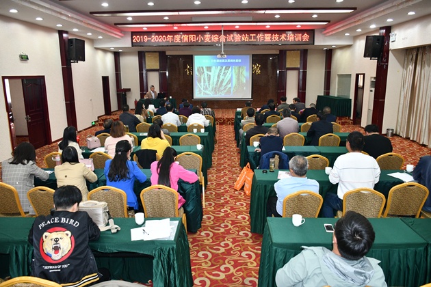10月11日,信陽(yáng)小麥綜合試驗站2018-2019年度工作暨技術(shù)培訓會(huì )召開(kāi),羅山、息縣、潢川、淮濱、固始、光山、平橋區等試驗站示范縣和國家貧困縣農業(yè)技術(shù)推廣依托單位分管領(lǐng)導、技術(shù)骨干、技術(shù)推廣人員60余人參加了會(huì )議。江蘇省揚州市里下河農科所小麥所所長(cháng)、國家小麥產(chǎn)業(yè)技術(shù)體系揚州綜合試驗站站長(cháng)高德榮研究員,河南省農業(yè)廳植保植檢站病蟲(chóng)防治科科長(cháng)、河南省小麥產(chǎn)業(yè)技術(shù)體系植保崗位專(zhuān)家于思勤研究員、河南省農科“四優(yōu)四化”優(yōu)質(zhì)小麥專(zhuān)項肥料利用專(zhuān)家黃紹敏研究員應邀參會(huì )。我院副院長(cháng)祁玉良研究員參加會(huì )議并講話(huà),院小麥研究所副所長(cháng)周?chē)诟毖芯繂T主持了會(huì )議。