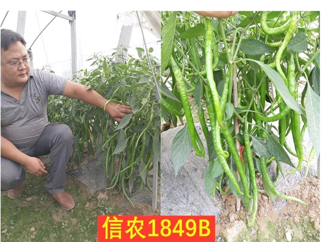 “信農1849B”《登記編號:GPD辣椒(2019)410720》屬雜交種,中晚熟,全生育期168天,果實(shí)線(xiàn)形,青熟果綠色,老熟果紅色;中抗病毒病CMV,中抗炭疽病,耐高溫,2014年進(jìn)行區域試驗;2015年進(jìn)行生產(chǎn)試驗;2016年進(jìn)行展示示范,并推廣種植,平均畝產(chǎn)5020千克,比對照華一1849增產(chǎn)1.95%,適宜在河南春季大棚種植。