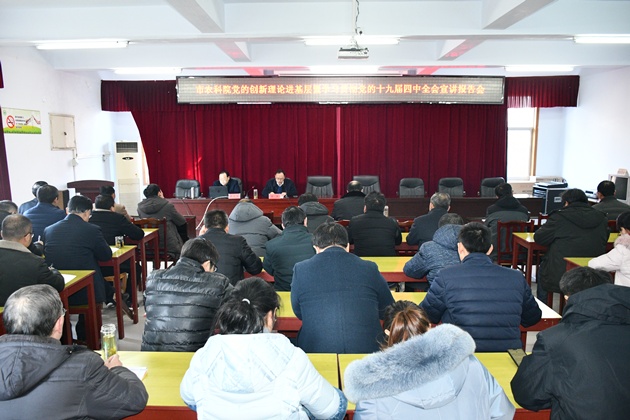 12月20日下午,我院舉辦黨的創(chuàng )新理論進(jìn)基層暨學(xué)習貫徹黨的十九屆四中全會(huì )精神宣講報告會(huì )。市委宣講團第二組組長(cháng),信陽(yáng)廣播電視臺黨委書(shū)記、臺長(cháng)蔣文俊作宣講報告。院黨委班子成員、科級以上干部和中級職稱(chēng)以上專(zhuān)業(yè)技術(shù)人員70余人聆聽(tīng)了報告。會(huì )議由院黨委書(shū)記李杰主持。