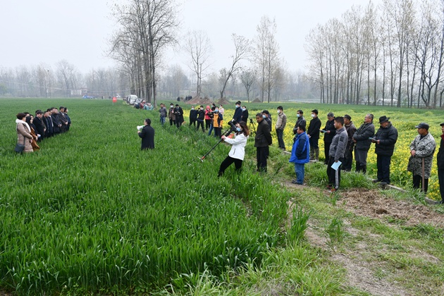信陽(yáng)位于我省最南部,是全國弱筋小麥生產(chǎn)核心區。當前,我市小麥生產(chǎn)與全省其它地市相比,已先期進(jìn)入了抽穗揚花期。為保證今年我市小麥生產(chǎn)安全和品質(zhì)安全,確保豐產(chǎn)豐收,4月3日,由我院承擔的河南省“四優(yōu)四化”優(yōu)質(zhì)小麥專(zhuān)項“豫南弱筋小麥新品種與抗逆保優(yōu)技術(shù)集成與示范”專(zhuān)題“一噴三防”現場(chǎng)觀(guān)摩會(huì )在羅山縣東鋪鎮召開(kāi),在全省率先打響了小麥赤霉病防控工作第一槍。