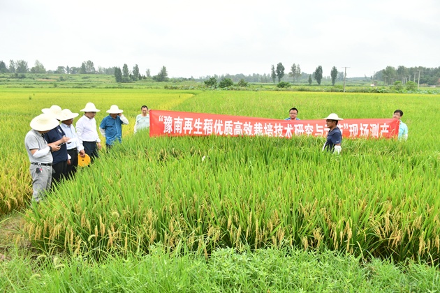當前,我市再生稻的頭季已進(jìn)入收獲期,8月8日,由我院舉辦的信陽(yáng)市創(chuàng )新應用專(zhuān)項“豫南再生稻優(yōu)質(zhì)高效栽培技術(shù)研究與示范”現場(chǎng)測產(chǎn)會(huì )在商城縣鄢崗鎮曹寨村召開(kāi),來(lái)自河南省農業(yè)科學(xué)院、信陽(yáng)農林學(xué)院、信陽(yáng)市農業(yè)農村局、新鄉市農業(yè)科學(xué)院、南陽(yáng)市農業(yè)科學(xué)院等科研院所高等院校的專(zhuān)家對該村再生稻示范片頭季的產(chǎn)量進(jìn)行了現場(chǎng)測產(chǎn)。