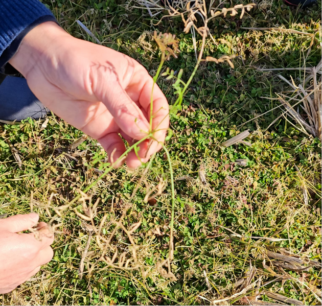 在我院、國家綠肥產(chǎn)業(yè)技術(shù)體系呂玉虎研究員帶領(lǐng)下,專(zhuān)家一行抵達示范基地,仔細查看不同區域紫云英與光葉苕子的生長(cháng)情況。經(jīng)調查發(fā)現,稻田自然落籽紫云英長(cháng)勢旺盛,基本實(shí)現全覆蓋,而后期播種紫云英田塊,由于降雨不足,出現稻田干裂,紫云英葉片卷曲、生長(cháng)緩慢等現象;留高茬稻田光葉苕子生長(cháng)旺盛,但稻草未覆蓋區域光葉苕子受害嚴重。針對受害綠肥,專(zhuān)家們認真察看植株的葉片色澤、病蟲(chóng)害跡象等關(guān)鍵信息。