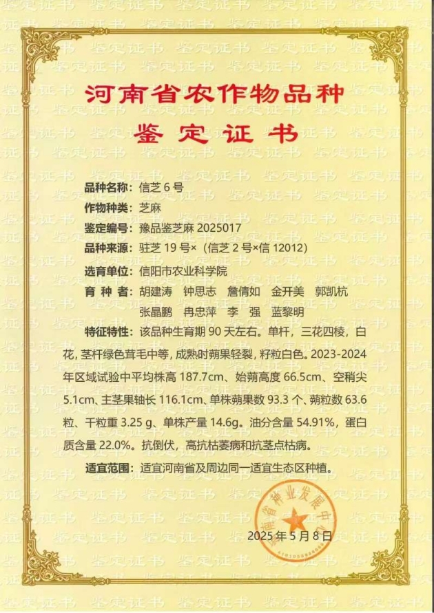 信芝6號(鑒定編號:豫品鑒芝麻2025017),2023-2024 年區域試驗中平均產(chǎn)量 97.23公斤/畝,生育期89.8天左右,平均株高 187.66厘米,平均含油量 54.91%,蛋白質(zhì)含量 22.0%。適宜在河南省及周邊同一適宜生態(tài)區種植。