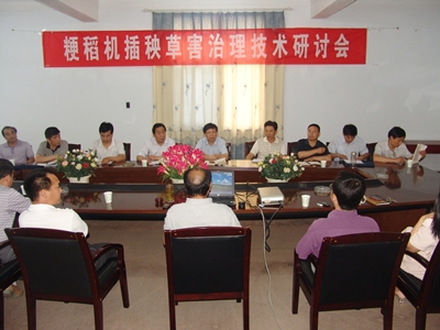 市農科院植保專(zhuān)家盧兆成研究員在會(huì )上首先做了“水稻機插秧田雜草的發(fā)生與防治”的學(xué)術(shù)報告,系統地介紹了水稻機插秧田草害發(fā)生較重的原因、豫南稻田的主要雜草、機插秧田化學(xué)除草策略以及可選用的高端除草劑。與會(huì )人員結合近年來(lái)工作的實(shí)踐,分別介紹了各縣區在治理機插秧草害方面的體會(huì )和建議。大家在研討中一致認為,隨著(zhù)豫南粳稻機插秧面積的迅速擴大,稻田草害已成為不可忽視的問(wèn)題,對粳稻高產(chǎn)、穩產(chǎn)的威脅越來(lái)越大。為了有效控制粳稻機插秧田雜草的發(fā)生與危害,必須加強監控和研究,盡快制定出一套科學(xué)高效合理的粳稻機插秧草害治理技術(shù)方案用以指導我市的粳稻生產(chǎn)。