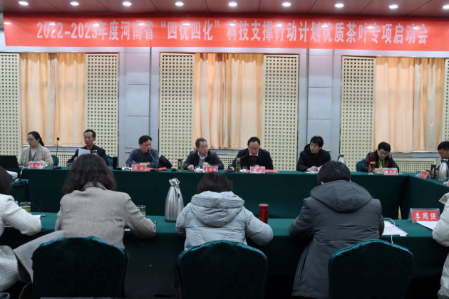 2月21日,由我院主辦的2022-2023年度河南省“四優(yōu)四化”科技支撐行動(dòng)計劃優(yōu)質(zhì)茶葉專(zhuān)項啟動(dòng)會(huì )在浉河賓館召開(kāi),省農科院科技成果示范推廣處處長(cháng)姜鴻勛、院黨委書(shū)記李杰、總農藝師段斌、羅山縣農科所所長(cháng)姜明波等相關(guān)領(lǐng)導,專(zhuān)項、專(zhuān)題、任務(wù)負責人,企業(yè)代表,我院茶葉科技人員、相關(guān)科室人員及新聞媒體記者等40余人參會(huì )。段斌主持會(huì )議。會(huì )議圍繞黨的二十大會(huì )議精神,以“四優(yōu)四化”為重點(diǎn),大力發(fā)展優(yōu)質(zhì)茶葉,拓寬老區人民增收致富的渠道,助力產(chǎn)業(yè)提檔升級。